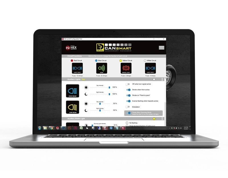 Im Gegensatz zur Gen I CANsmart können alle vier Stromkreise der Gen II eine Dauerleistung von 10 Ampere liefern und jeder Stromkreis kann für den Betrieb eines beliebigen Zubehörtyps konfiguriert werden. Die maximale Stromaufnahme für das gesamte Gerät bleibt bei 30 Ampere Dauerleistung. Die Gen II verfügt außerdem über eine neue Einstellung für das Zusatzlicht, mit der Sie Ihre Zusatzscheinwerfer für zusätzliche Auffälligkeit modulieren können.