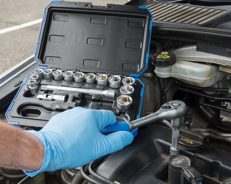 Six point socket made from chrome vanadium steel that's hardened and tempered with a satin finish. Supplied with a 72 tooth reversible soft grip ratchet and accessories. Packed in a plastic storage case.