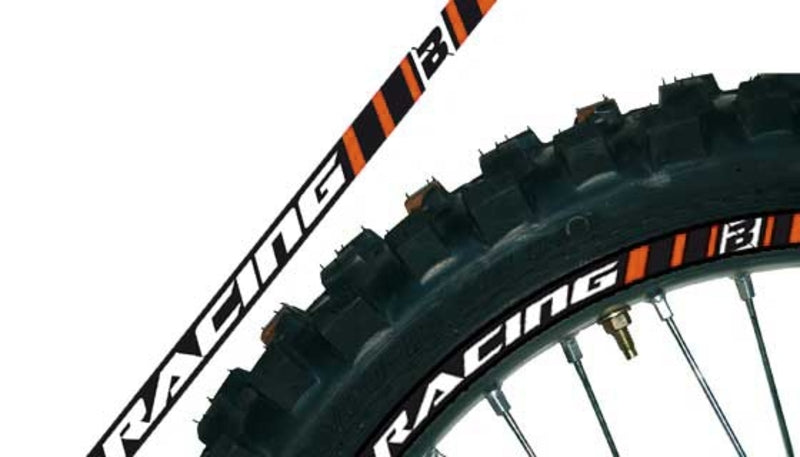 Das Aufkleber Set besteht aus 8 Aufkleber für die vordere Felge und 8 Aufkleber für die hintere Felge + 2 Ersatzaufkleber. Man kann die Felgenschulter mit speziell geformten Klebestreifen dekorieren. Das Set ist für 17'', 18'', 19'' und 21'' Felgen geeignet. Für die Minicross-Modellen soll man die Aufkleber an den Extremitäten ausschneiden, um sie zum unteren Durchmesser der Felgen zu passen.