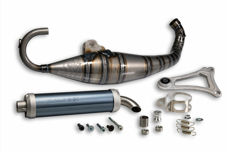 Die Entwicklung der Rennauspuffe schreitet im gleichen Maße voran wie die Malossi-Zylinder, und um die beste Leistung zu erzielen, ist es wichtig, den Auspuff auf den Zylinder abzustimmen, für den er entworfen wurde.
