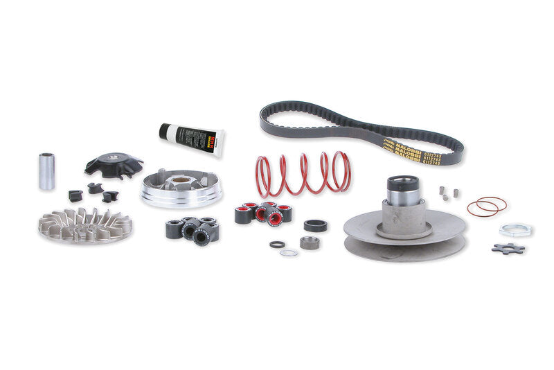 Dieses neue Getriebesystem nutzt die Vorteile der bereits im letzten Jahr angebotenen Malossi-Komponenten voll aus, Das neue System nutzt die bereits im letzten Jahr angebotenen Malossi-Komponenten voll aus und fügt einige neue Teile hinzu, die das Gesamtsystem für die enorme Leistung besonders geeignet machen. Dieses neue System stützt sich auf die neue feste Riemenscheibe des Drehmomentwandlers, die einen größeren Durchmesser hat und den neuesten Spezifikationen entspricht. Der größere Durchmesser dieser Riemenscheibe ermöglicht einen größeren Geschwindigkeitsbereich im Vergleich zu der ursprünglichen Riemenscheibe, die einen deutlich kleineren Außendurchmesser hat.
