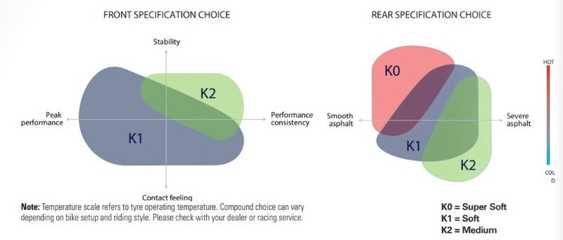 Die Wahl der richtigen Mischung des RACETEC™ SM am Vorderreifen ist von zwei Faktoren abhängig: dem Reibungskoeffizienten des Asphalts (je nach Rennkurs entweder ein hohes oder niedriges Reibungslevel) und der Asphalttemperatur (hier liegt die Schwelle bei etwa 25-30 Grad Celsius).
