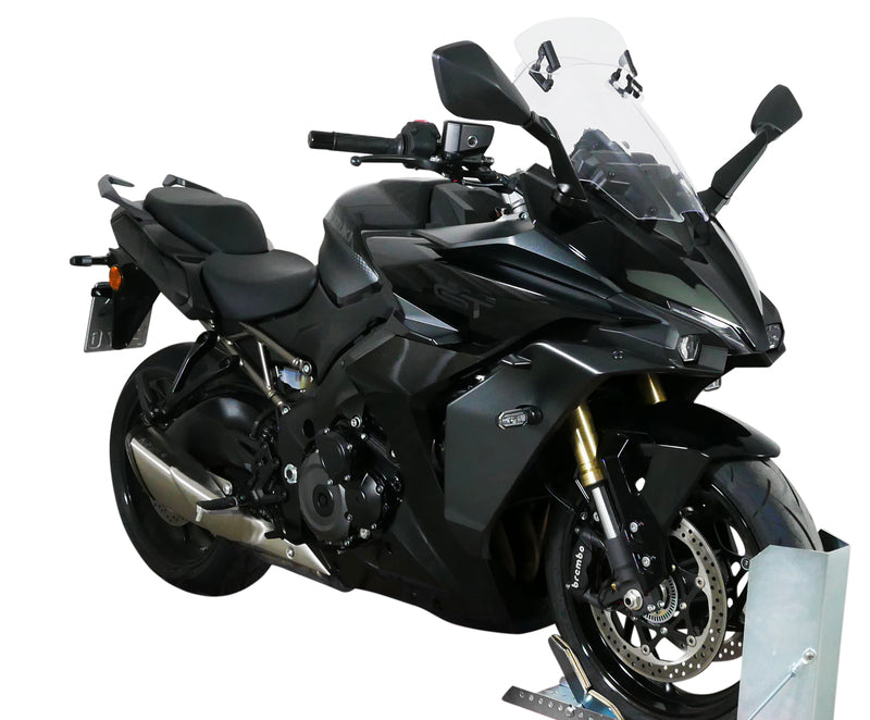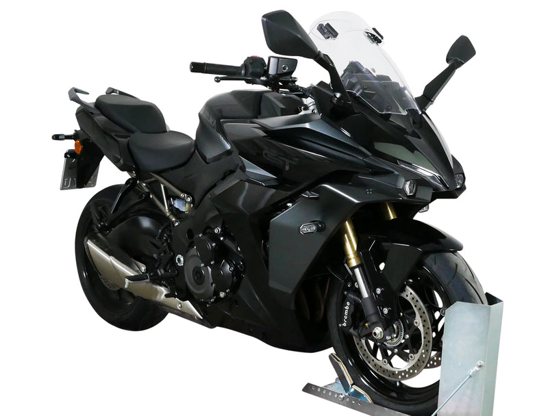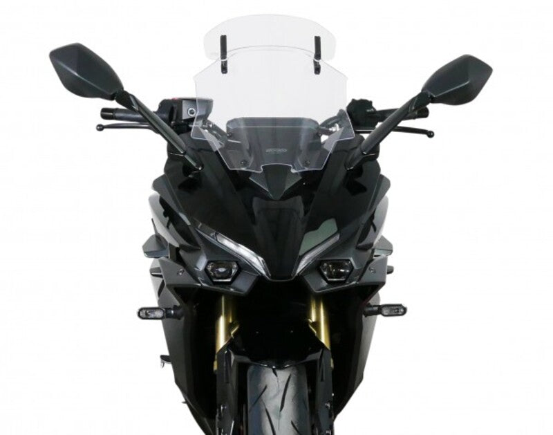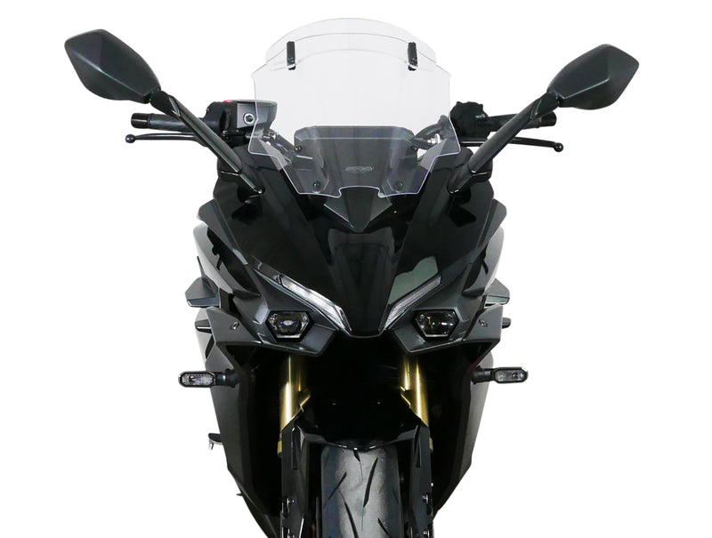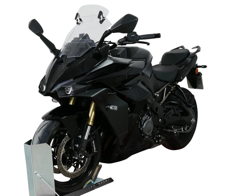 Diese Tourenscheibe hat am Ende einen Spoiler, der sich manuell in sieben Stufen auf die gewünschte Position verstellen lässt. Durch die Hinterströmumg des Spoilers wird der Winddruck vom Fahrer genommen und gleichzeitig die Turbulenzen reduziert. Die Vario- Touringscreen ist in klar und rauchgrau erhältlich.