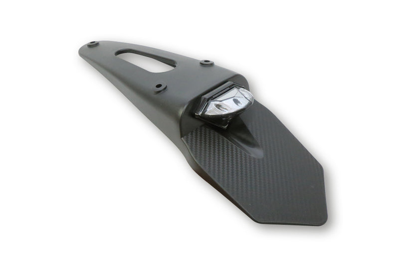 Diamantförmiges Rücklicht mit getöntem Glas, Heckplastik und Spritzschutz. Geeignet zur universalen Befestigung mittels schwarzer Plastik am Fahrzeugheck, E-geprüft.