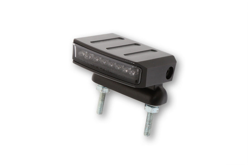 Vertikal verstellbare LED Rücklicht / Bremslicht Kombination mit Universalhalter, Nummernschildbeleuchtung, schwarzem Metallgehäuse und getöntem Glas. E-geprüft.