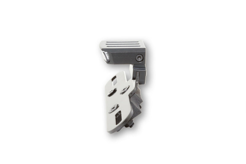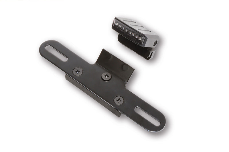 Universales LED Rücklicht / Bremslicht Kombination mit Nummernschildhalter und Nummernschildbeleuchtung in einem schwarzen Metallgehäuse und getöntem Glas. Das Rücklicht ist abnehmbar, E-geprüft.