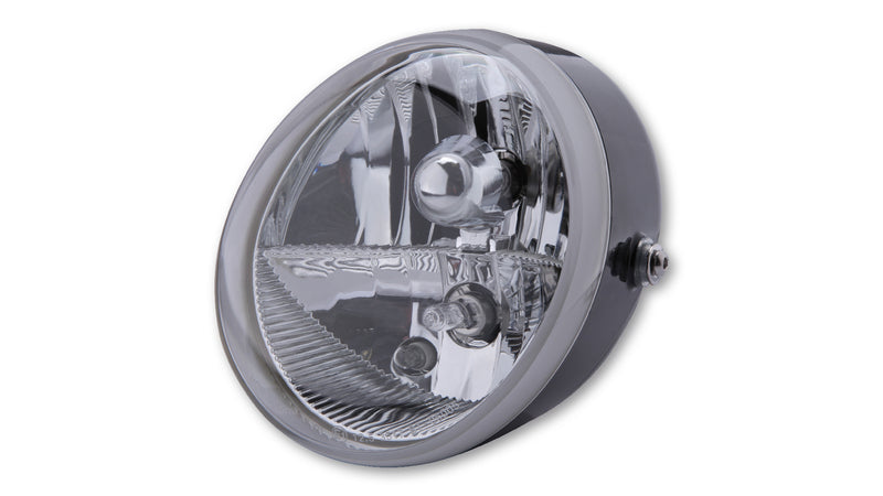 Asymmetrischer Hauptscheinwerfer im V-Rod Style mit schwarzem Kunststoffgehäuse und seitlicher Befestigung, E-geprüft.
