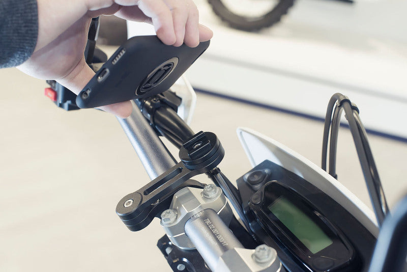Fasten the MOTO MOUNT PRO to the handlebars of your motorcycle and you are ready to mount the SP ConnectTM PHONE CASE(or UNIVERSAL INTERFACE) by placing it on the mount and turning it 90° clockwise. To further protect your smartphone the mount also has a unique vibration dampening system that cuts G-forces by up to 40% (depending on bike & phone model).