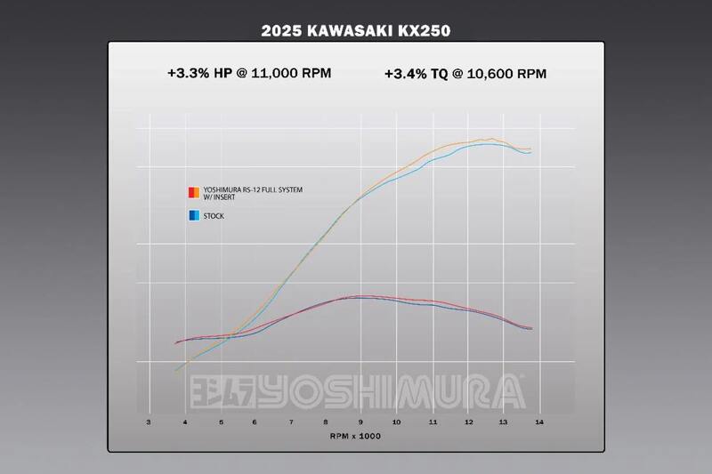 Die neueste KX250F verfügt über ein neues Fahrwerks- und Motorpaket. Das bedeutete, dass es an der Zeit war, sich an die Arbeit zu machen, um zu sehen, was man tun kann, um die Leistung der neuen KX zu steigern. Während der Entwicklung reagierte die neue 250er sehr gut auf unsere RS-12. Wir konnten bis zu 3,3 % mehr Leistung bei 11.000 U/min und bis zu 3,4 % mehr Drehmoment bei 10.600 U/min erreichen. Dies verleiht der 2025 KX250F zusätzliche Leistung im oberen Bereich und mehr Konnektivität im unteren und mittleren Bereich des Leistungsspektrums.